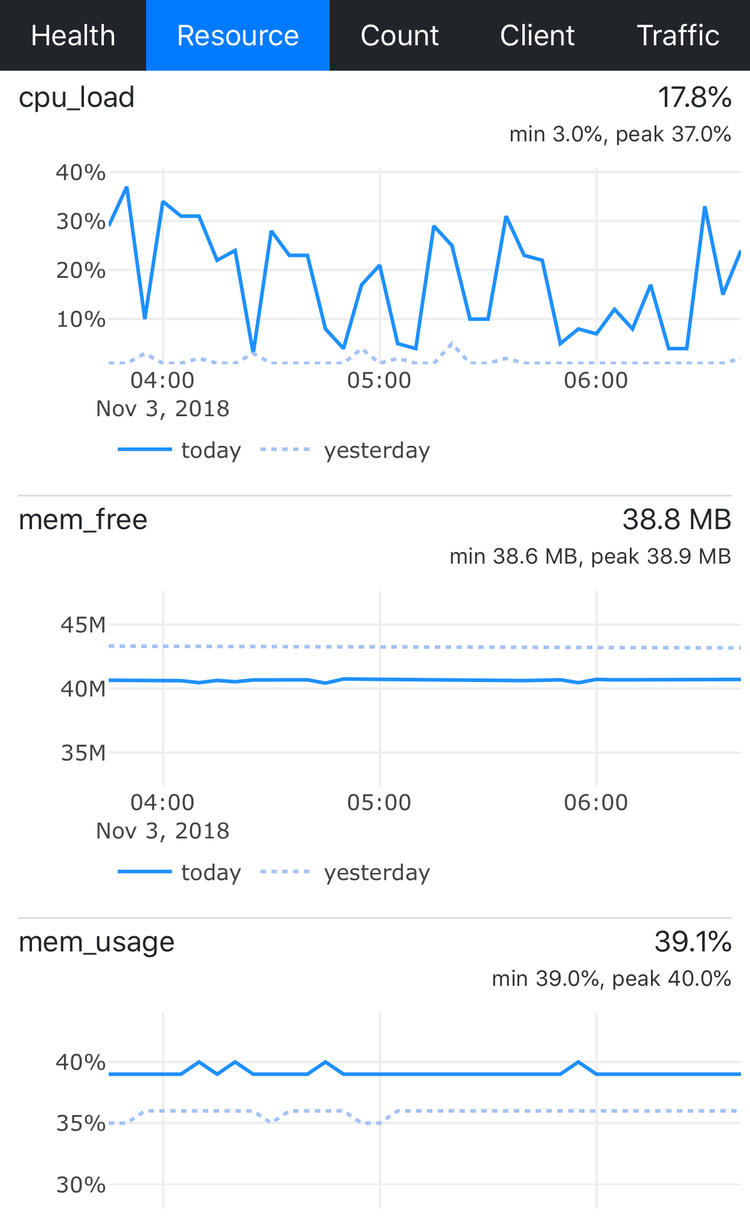 At-a-glance visualization and compare with yesterday. Health, resources, client count and traffic...